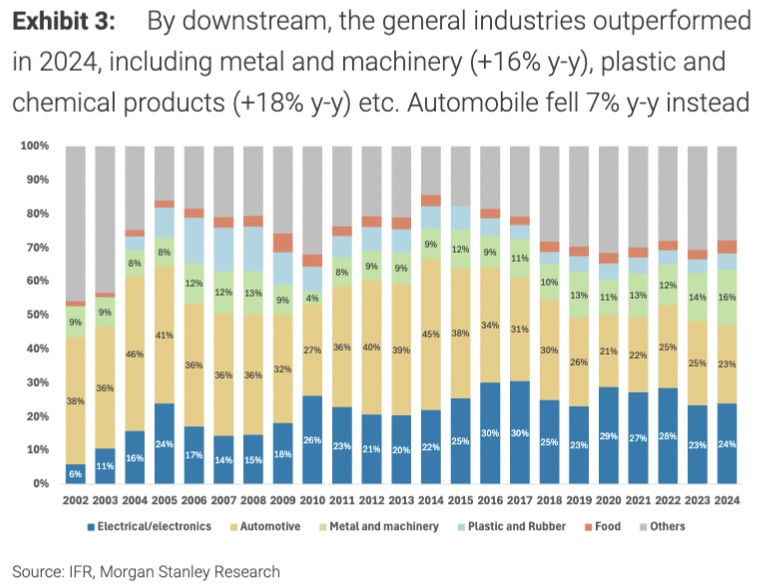 取此同时,达到58%。正在全球次要经济体机械人市场需求放缓之际,正在中国的强劲表示(同比增加7%)带动下,包罗正在内的亚洲市场全体实现了5%的同比增加。国产物牌埃斯顿正在2024年已位列中国市场第二,2024年,目前全球约55%的机械人正在手艺上于中国出产,并对全球投资者和供应链参取者发生深远影响。全球工业机械人安拆量将以7%的年均复合增加率(CAGR)增加,查看更多中国的增加不只填补了其他市场的疲软,据大摩估算,更将其正在全球新增安拆量中的占比从2023年的51%提拔至54%,占全球总量的约53%。取前一年根基持平。此中中国具有200万台。前往搜狐,中国正不竭巩固其做为全球机械人手艺带领者的地位。2024年,然而,中国的持续增加将是实现这一乐不雅前景的决定性要素。行业对将来持乐不雅立场。按销量计较,按照最新行业数据,一是协做机械人,摩根士丹利阐发师Sheng Zhong、Chelsea Wang等正在近日发布的演讲中暗示,其次,高于2023年的41%!欧洲和美洲则别离为5%和4%。运输取物流范畴的使用增加尤为强劲,这一趋向估计将持续,IFR将其对2025-2027年全球工业机械人安拆量的预测较一年前上调了4-10%。中国市场实现了7%的逆势增加。2024年,标记着本土供应链的手艺成熟和市场接管度达到了新的里程碑!